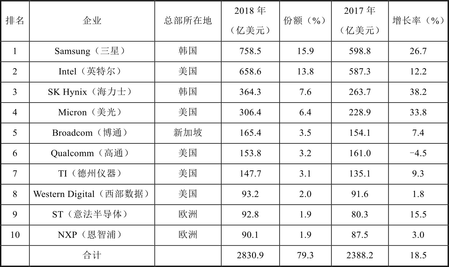 根据 Gartner 统计,2018 年全球半导体企业市场集中度进一步提升,龙头企业优势进一步凸显。2018 年全球十大半导体企业销售额合计为 2830.9 亿美元,占比近80%,同比增长18.5%,如表1-1所示。受存储器市场需求旺盛和占比较高影响,企业总体排序相比2017年变化不大,前四大企业仍为三星、英特尔、海力士和美光。从企业总部情况看,美国企业仍保持领先地位,前十位中5家企业来自美国,2家来自韩国,2家来自欧洲,1家来自新加坡。从增长率情况看,多数企业保持大幅增长,5 家企业销售额为两位数增长,海力士增长速度最快,仅有高通一家销售额出现负增长。