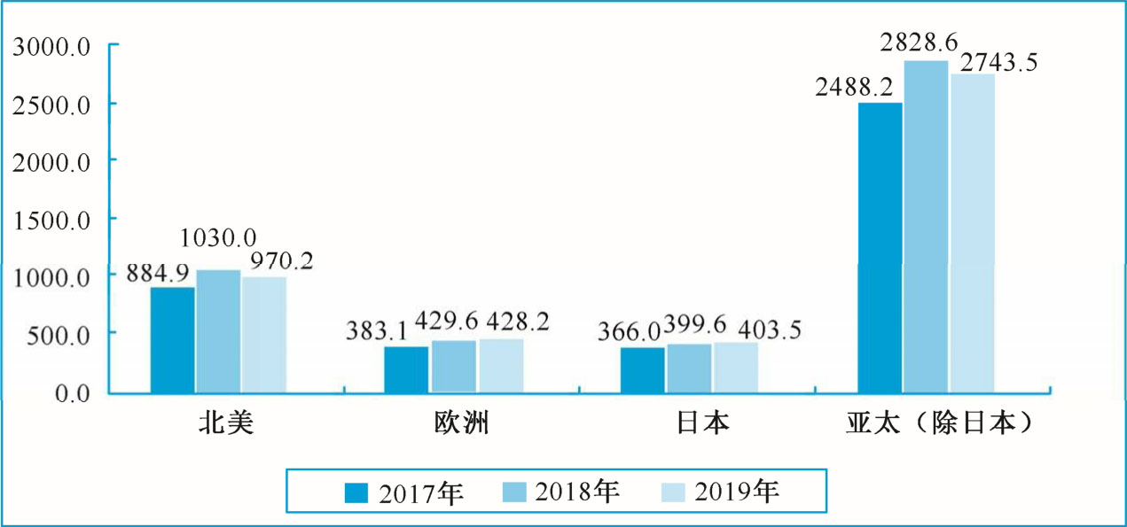 图1-6 2017—2019年全球半导体区域销售情况(亿美元)