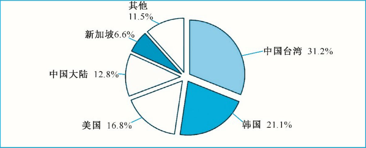 日本半导体产品的全球市场份额虽略有下滑,但在半导体材料和设备等配套产业领域优势显著。日本的半导体材料企业占据全球市场的 50%以上。日本信越和三菱住友是全球最重要的半导体硅片供应商,占据全球半导体硅片近60%的市场份额。2018年日本出口半导体硅片约35亿美元,主要出口至中国台湾、韩国、美国、中国大陆、新加坡,分别占出口总额的 31.2%、21.1%、16.8%、12.8%、6.6%,如图1-12所示。
