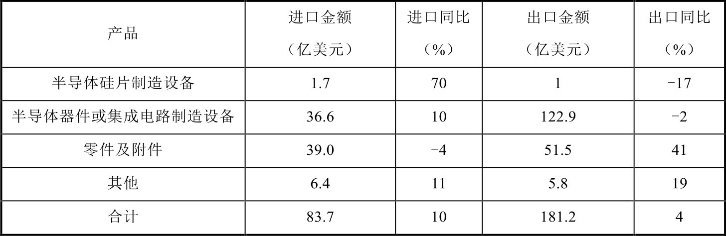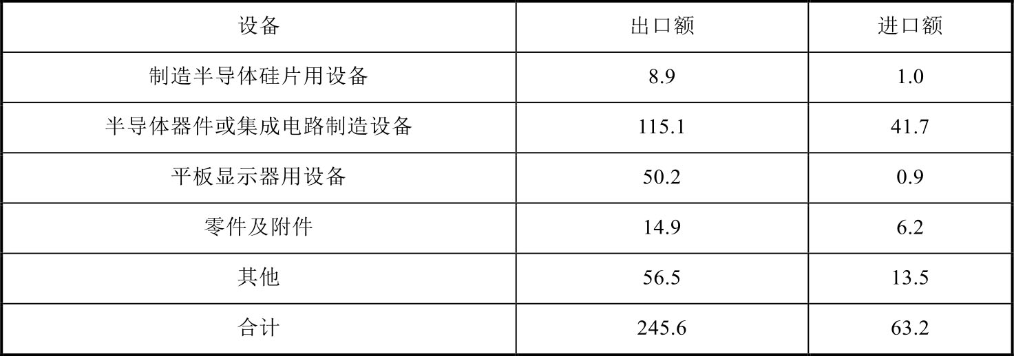 表1-9 2018年日本半导体设备及零配件进出口额统计(亿美元)