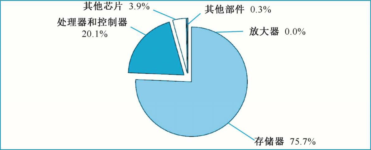 韩国是仅次于美国的全球第二大半导体产品生产国,韩国半导体企业在全球市场占有率近30%,尤其在存储器领域优势显著。2018年韩国集成电路出口1097.8亿美元,同比增长27%;进口345.2亿美元,同比增长3%,如表1-8所示。从出口结构看,韩国出口产品主要是存储器,共 830.5 亿美元,占比约为76%,如图 1-11 所示。进口产品以处理器和控制器、存储器为主,占比分别约为38%和47%。