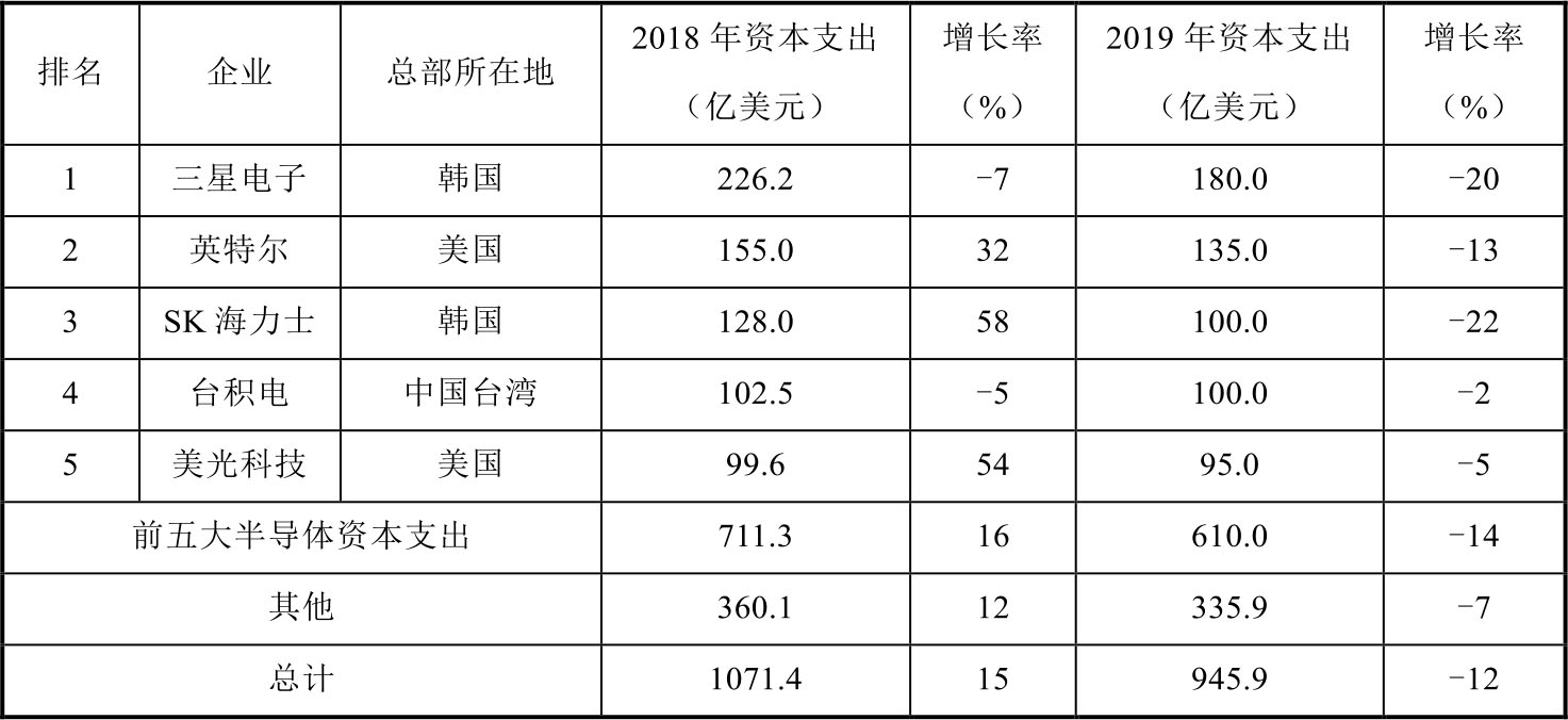 根据 IC Insights 的统计数据显示,2018 年全球半导体企业资本支出超过1000亿美元,达到历史最高值,同比增长15%,如表1-2所示。前五大半导体资本支出占比达到66%,同比增长16%。预计2019年半导体行业整体资本支出将出现下降,由于存储器市场疲软需求不足,三星电子、SK 海力士和美光科技三大龙头企业的资本支出将从454亿美元下降到375亿美元,下降17%。全球半导体企业资本支出总额下降到 946亿美元,其中前五大企业下降 14%,至610亿美元。