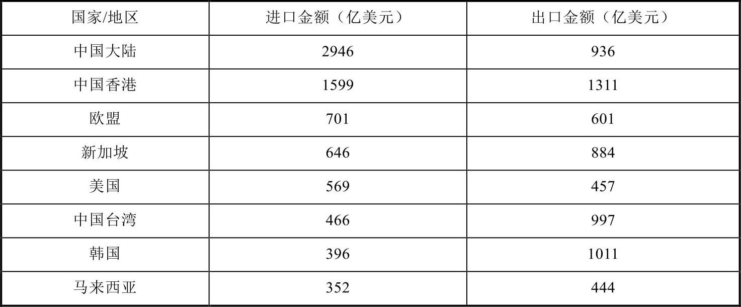 集成电路进口区域方面,主要进口国和地区如中国大陆、马来西亚、越南、墨西哥等是全球主要的电子整机产品制造基地。其中,中国大陆一家独秀,进口额约占全球集成电路产品总进口额的 30%,其次为中国香港、欧盟、新加坡、美国等。值得关注的是,中国香港和新加坡由于具有良好的区位优势和自由贸易环境,是全球主要的集成电路产品中转站,出口集成电路产品分别达到1311亿美元和884亿美元,进口分别达到1599亿美元和646亿美元,如表1-5所示。