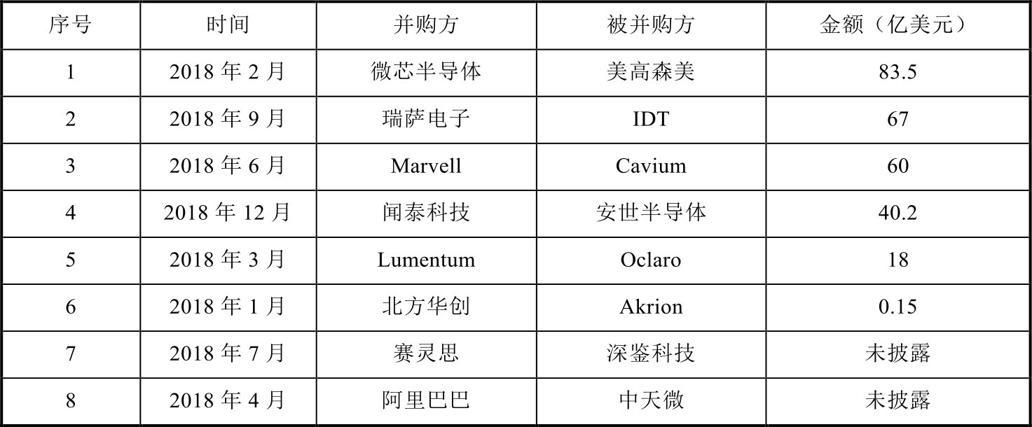 2018年全球半导体重大并购案例中,几件受人关注的并购案例来自中国企业,包括闻泰科技并购安世半导体、北方华创并购 Akrion、赛灵思并购深鉴科技、阿里巴巴并购中天微等,如表 1-4 所示。其中,闻泰科技并购安世半导体成为中国半导体领域最大的并购案,安世半导体是全球十大半导体公司恩智浦的标准产品部,2016年被建广资产等国内资本以27.6亿美元收购,后重组为安世半导体;闻泰科技为全球最大的手机 ODM 公司,同时进军笔记本电脑、平板电脑、汽车电子等领域,此次并购可以与闻泰科技现有业务形成较强的互补,形成产业协同效应。