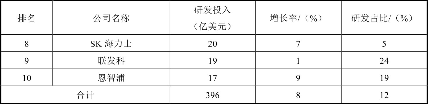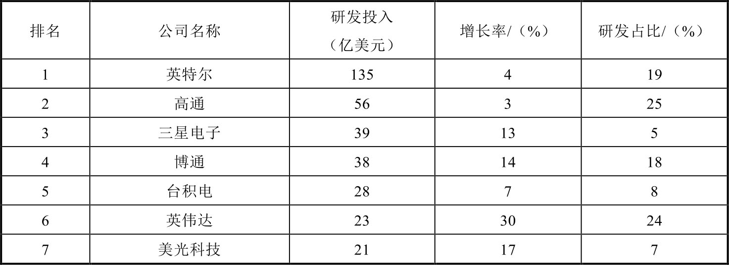 前十大半导体企业研发投入中,英特尔仍高居榜首,从2012年研发费用突破百亿美元以后,已经连续7年保持增长,2018年研发投入高达135亿美元,同比增长 4%,占销售收入的比重稳定在 20%左右。高通作为全球最大的芯片设计公司,研发费用排名第二,占销售额的比重也逐年增长,2018 年为 56 亿美元。英伟达为排名前十的企业中研发投入增长最快的,2018年研发投入为23亿美元,同比增长 30%,主要是在人工智能市场旺盛的带动下,企业的销售额和研发都出现大幅增长,如表1-3所示。