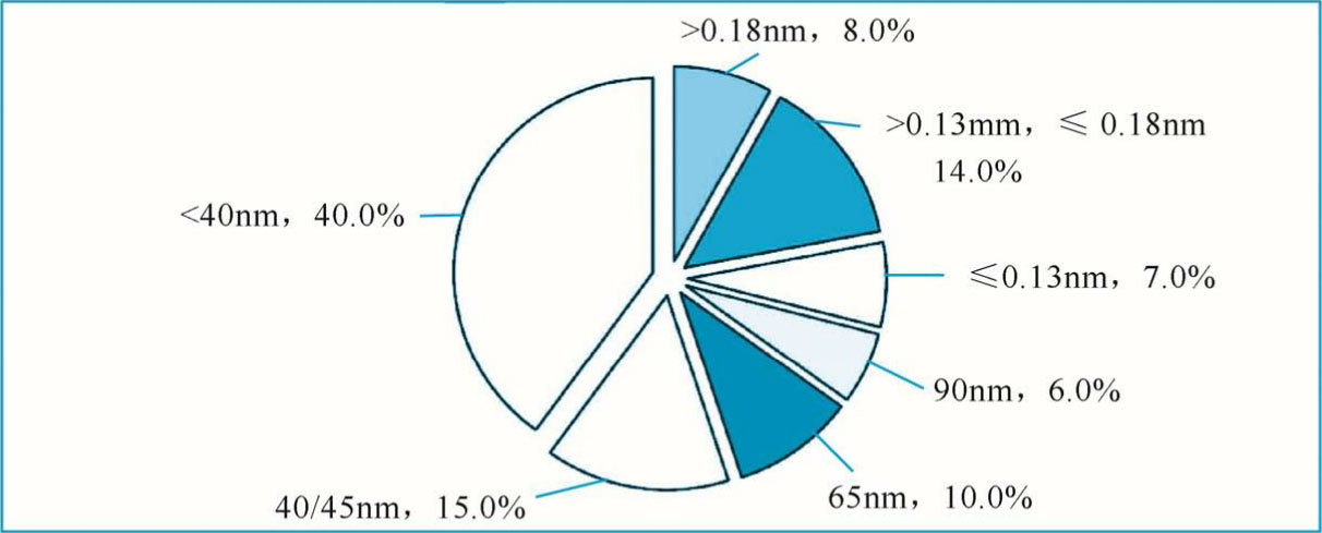 2018年全球代工厂销售收入为576亿美元,从代工厂的关键尺寸情况看,其中40nm以下尺寸仍占比最高,市场份额为40.0%,如图1-5所示。16/14nm及以下代工占比逐渐提升,代工龙头台积电 20/16nm 及以下销售额占比已经高达 50%,其中 7nm 在 2018 年第三季度实现量产后,市场份额占比迅速提升到23%。40/45nm 代工仍有较大市场,主要受图像传感器、射频器件等特色工艺产品驱动,市场份额为 15.0%。0.13~0.18 μ m 代工占比提升到第三位,分立器件、功率器件等产品仍有较大的代工需求,市场份额为14.0%。