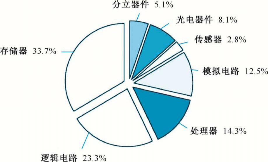 根据WSTS的统计分类,半导体主要包括集成电路(模拟电路、逻辑电路、处理器、存储器等)、分立器件、光电器件和传感器四大类。四大类产品2018年的市场规模分别为 3932.9 亿美元、241 亿美元、380.3 亿美元和 133.6 亿美元,市场份额分别为83.8%、5.1%、8.1%和2.8%,如图1-3所示。在存储器市场需求大幅上涨的情况下,集成电路仍为增长速度最快的产品类别,2018年同比增长 14.6%;分立器件其次,仍保持较快增长,同比增长 11.3%;光电器件延续了上年的增长速度,增速为9.2%;传感器在上年大幅增长的情况下,本年增速有所衰退,同比增长6.2%。