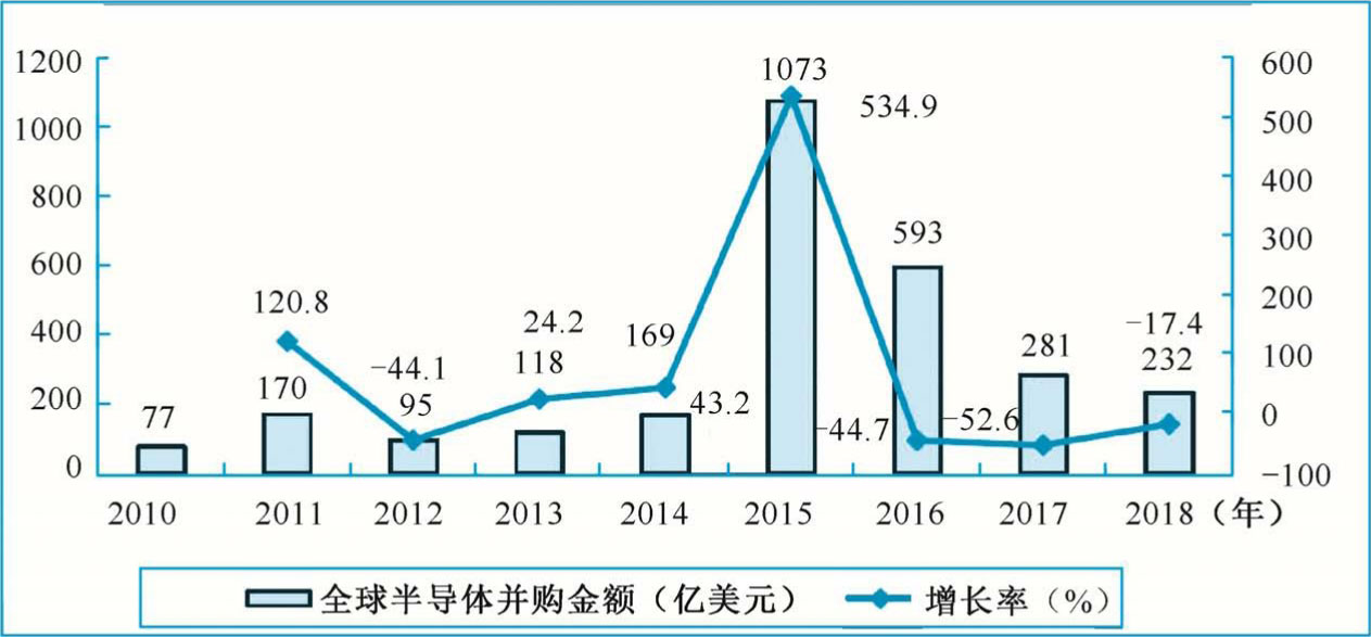 继 2017 年全球半导体并购步伐放缓之后,2018 年全球半导体并购案例进一步减少,全年涉及并购的金额下降到232亿美元,仅有2015年1073亿美元的1/5,但是仍为2010—2014年平均并购金额的两倍,如图1-10所示。主要受全球政治经济宏观环境不确定性和中美经贸摩擦的持续,全球半导体企业之间的大型并购受到一定阻碍。2018年高通公司宣布以440亿美元的现金收购恩智浦的交易,最终未达成收购。博通公司宣布以1300亿美元收购高通将创造半导体并购历史上的最高金额,随后被美国政府一纸禁令否决。预计随着并购标的的减少和全球反垄断机构的审查,后续巨头企业之间的大型并购将逐渐减少,面向新兴应用的并购将成为重要趋势。