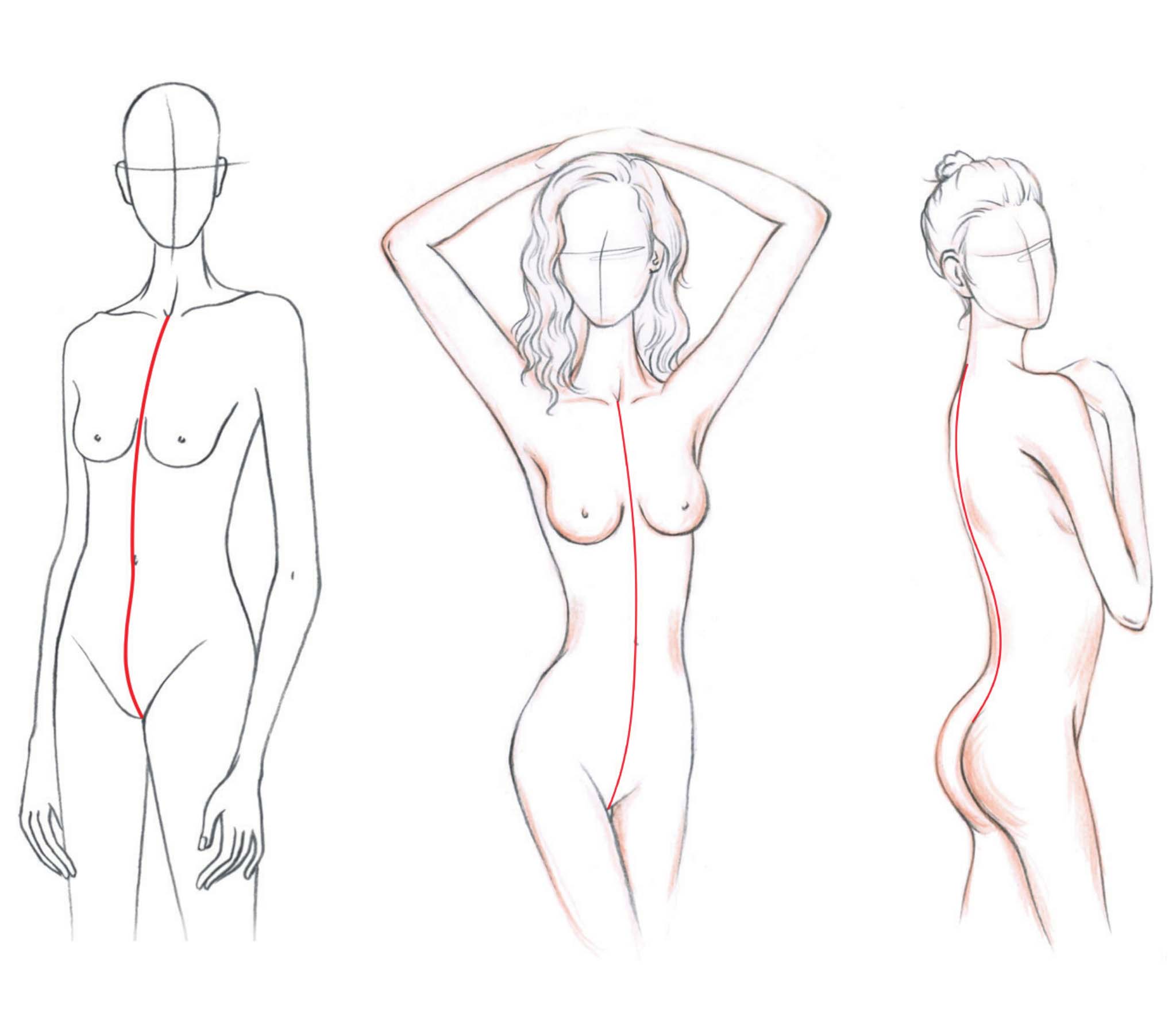 中心线是平分人体躯干的一条线,它位于人体躯干的正中央。中心线是绘制胸腔与盆腔的重要依据。当人体正面直立时,前后中心线则垂直于地面,与重心线重合。当人体运动时,中心线随着人体动态而弯曲,变成了一条曲线。