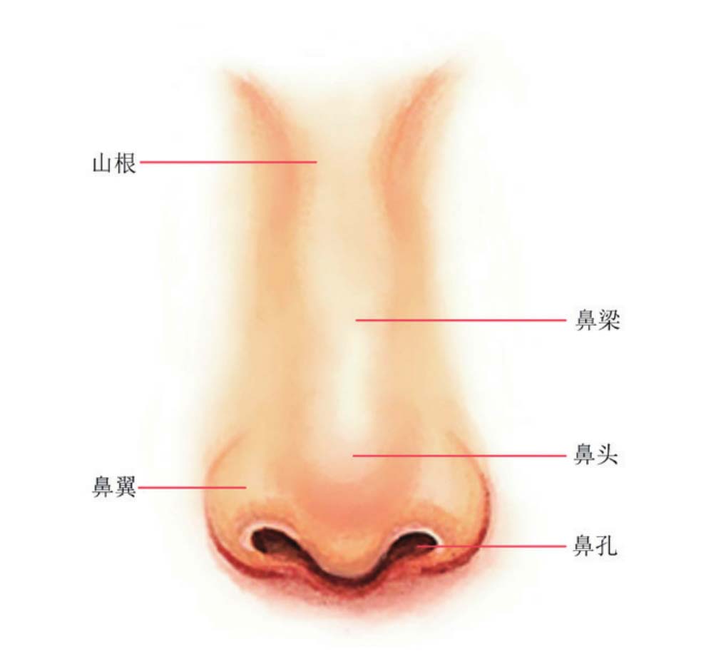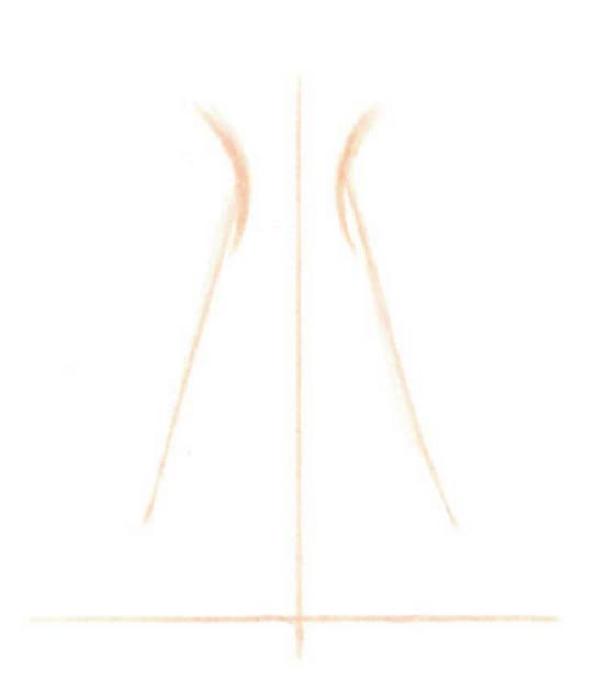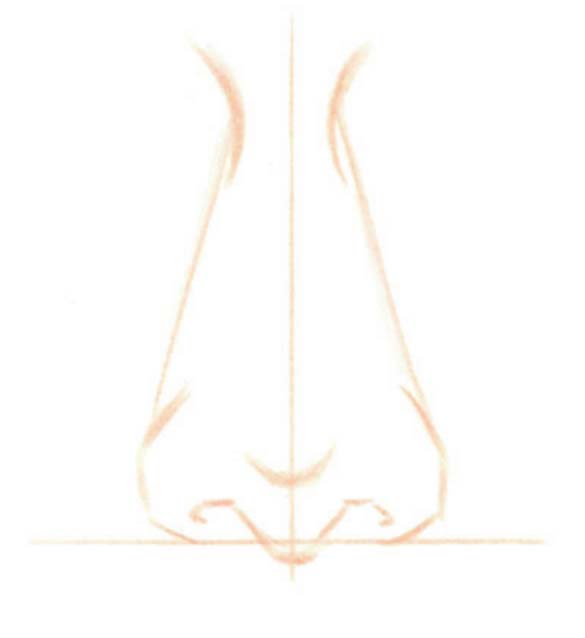 用上窄下宽的梯形概括出鼻子的外轮廓。绘制中轴线,鼻子左右两侧以中轴线对称。