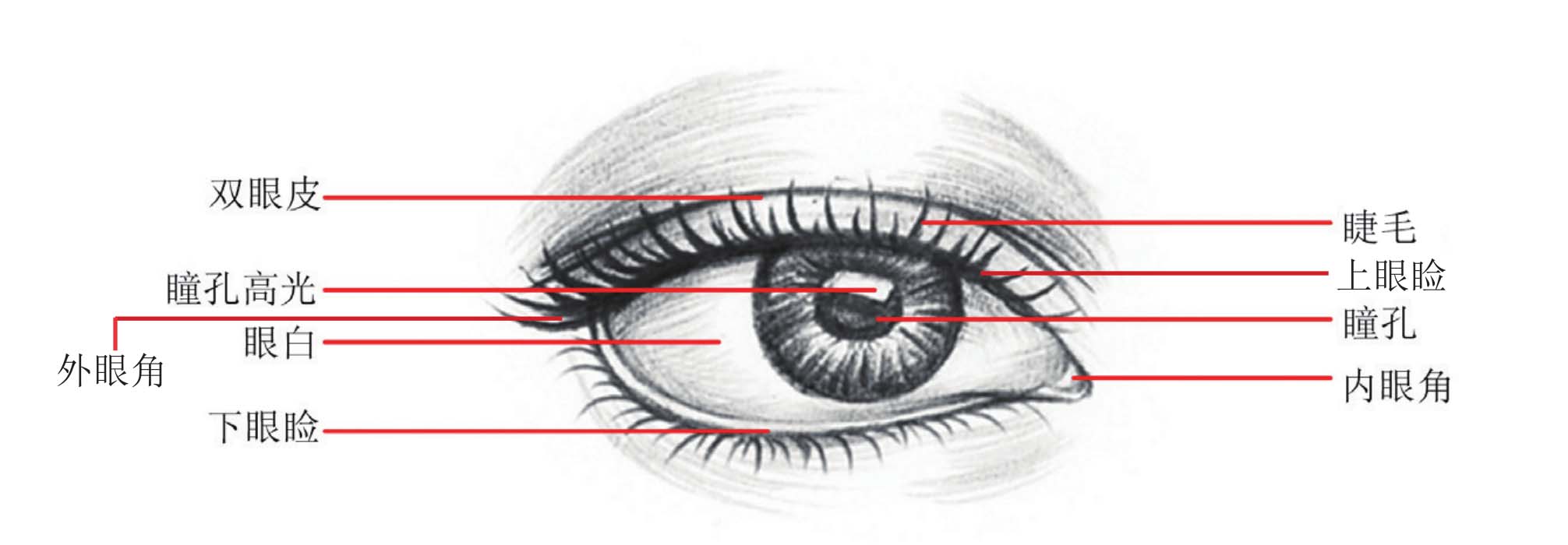眼睛在五官中是最能体现人物特点的部位,眼珠类似于球形,位于眼眶内,其结构是由瞳孔和虹膜组成的同心圆,但由于上眼睑遮挡的关系,眼球呈现的不是一个正圆形。在绘制时注意表现出瞳孔中的高光,以使眼睛更加神采飞扬。随着眼睛观看方向的改变,眼珠的形状也会随之产生变化,呈现出不同的扁圆形。