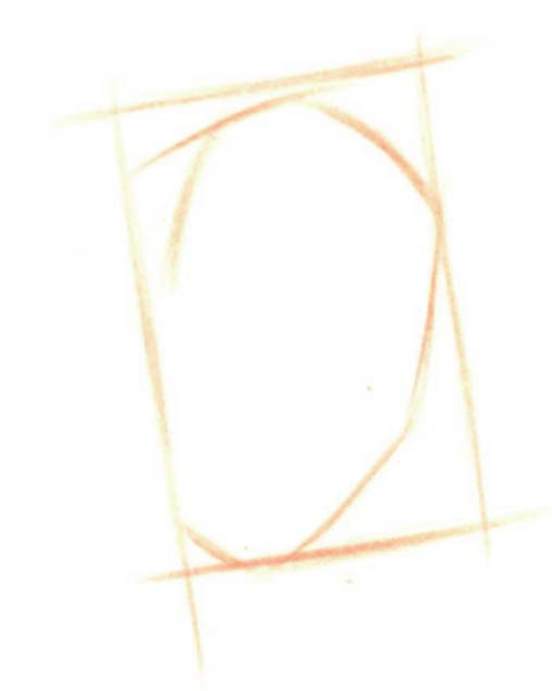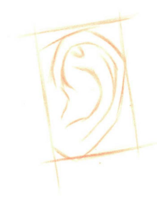先绘制出纵向的矩形,找出耳朵的长宽比例,耳朵的外部形状类似于上宽下窄的“C”形。