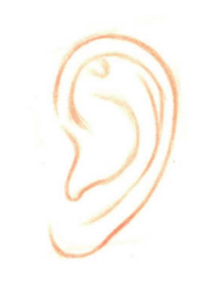 耳朵由耳轮、耳屏、三角窝、耳垂等几个部分组成。绘制时简略概括即可,先把握基本结构特征,然后再绘制耳朵的小形体。
