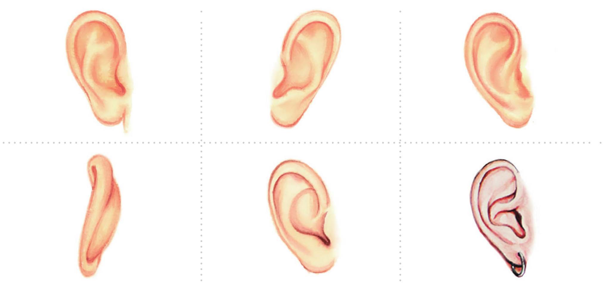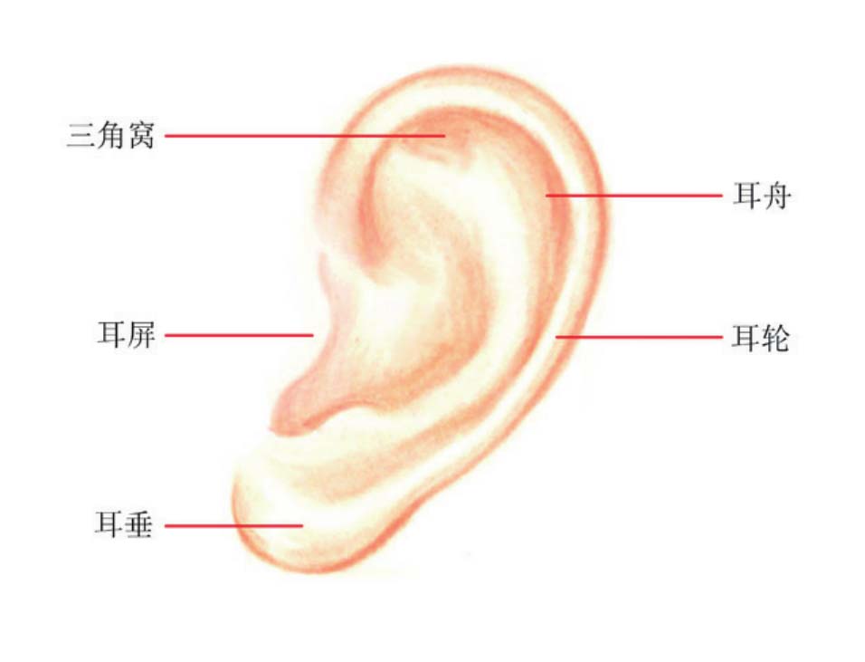 耳朵位于眉毛和鼻底水平线之间,属于中庭的位置。从正面看时,左右耳朵基本对称。