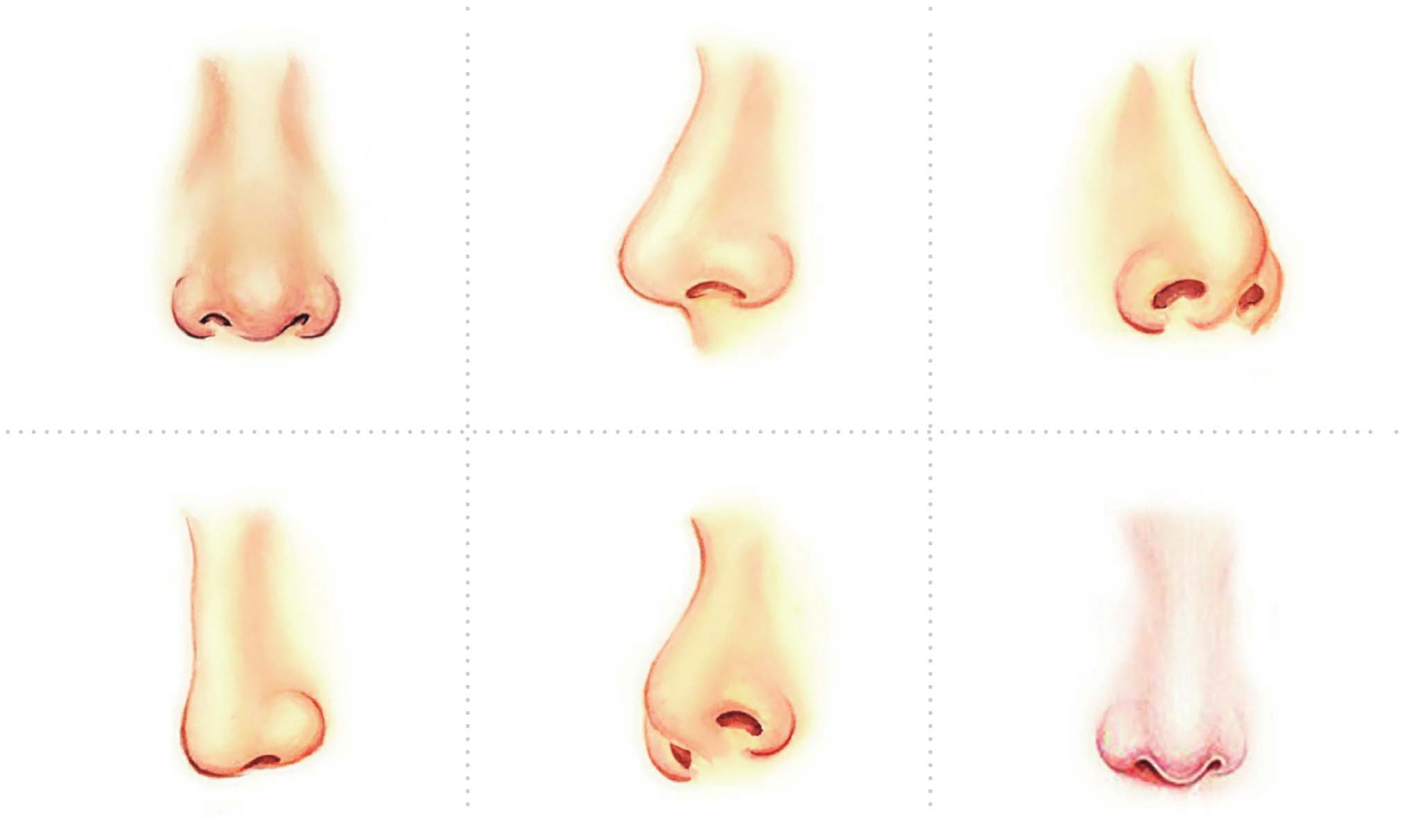 鼻子是五官中体积感最强的器官,从正面看时,鼻子位于人的面部正中央,可以看到左右两边的鼻翼。从侧面看时,鼻梁的轮廓线较明显。在绘制服装画时为了突出眼睛,鼻子可以简单概括。