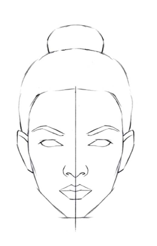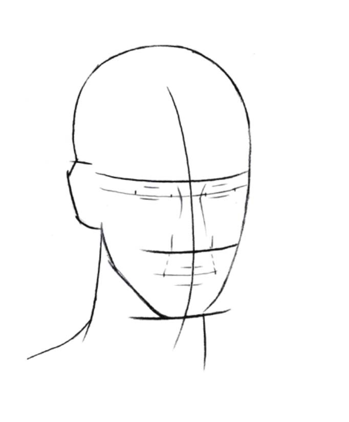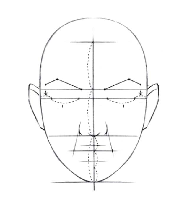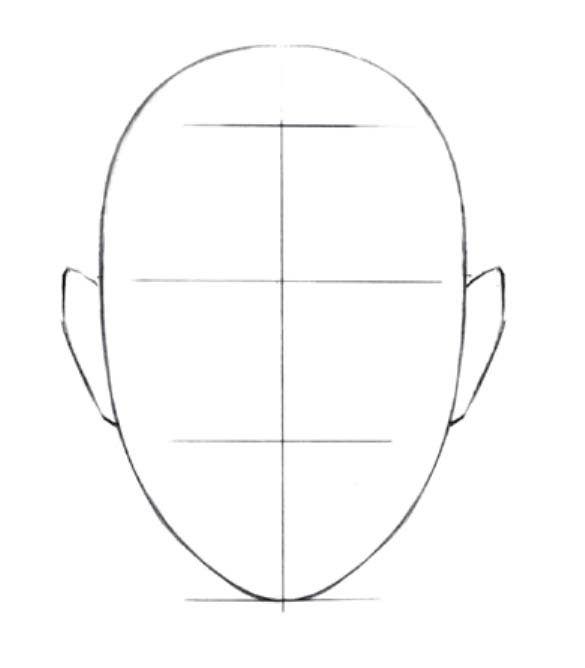 用直尺绘制一条垂直的中线,根据三庭的概念,将直线平均分成三等份。然后根据头部长度确定头部宽度,正面头部长宽比例约为3∶2。用圆顺的线绘制出头部的外轮廓,在头部两侧第二庭处,确定耳朵的位置。
