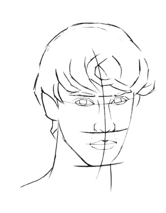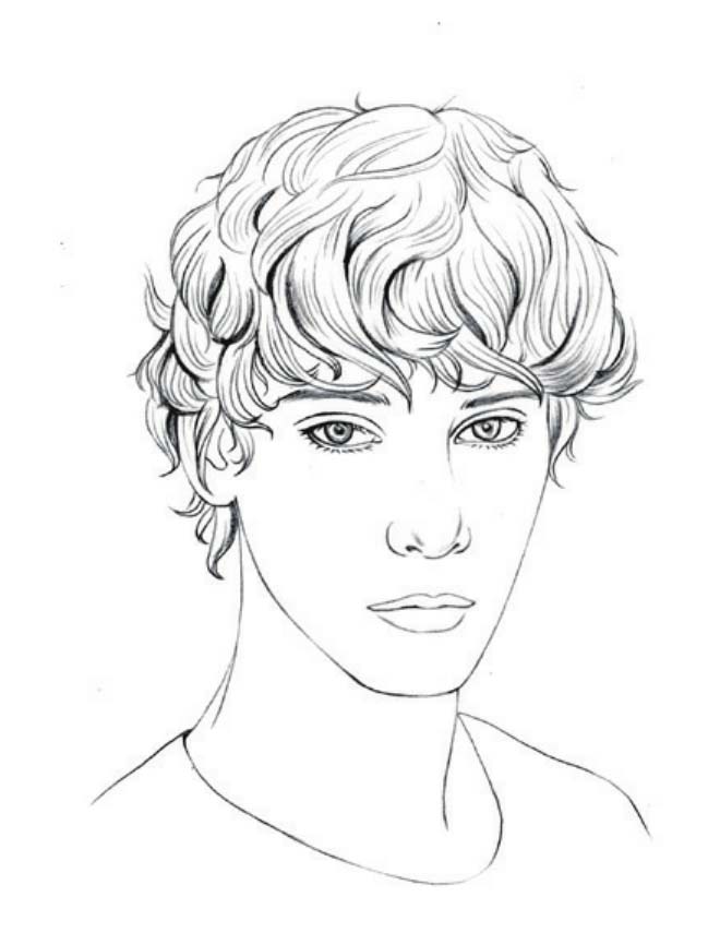 进一步绘制五官的轮廓,男性面部轮廓线的转折较为明显。然后根据头部轮廓绘制头发,注意对额头前的头发进行分组,形成疏密对比。
