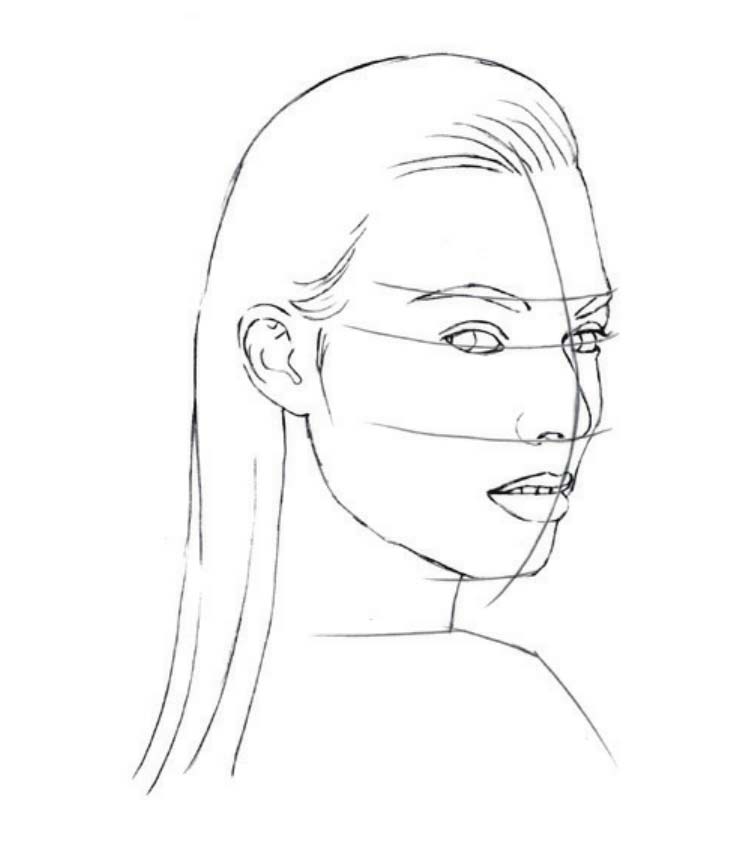 根据透视线标出五官的位置,面部侧转的一边,眉毛、嘴和眼睛的长度会缩短,鼻翼和鼻孔的角度也会产生变化。