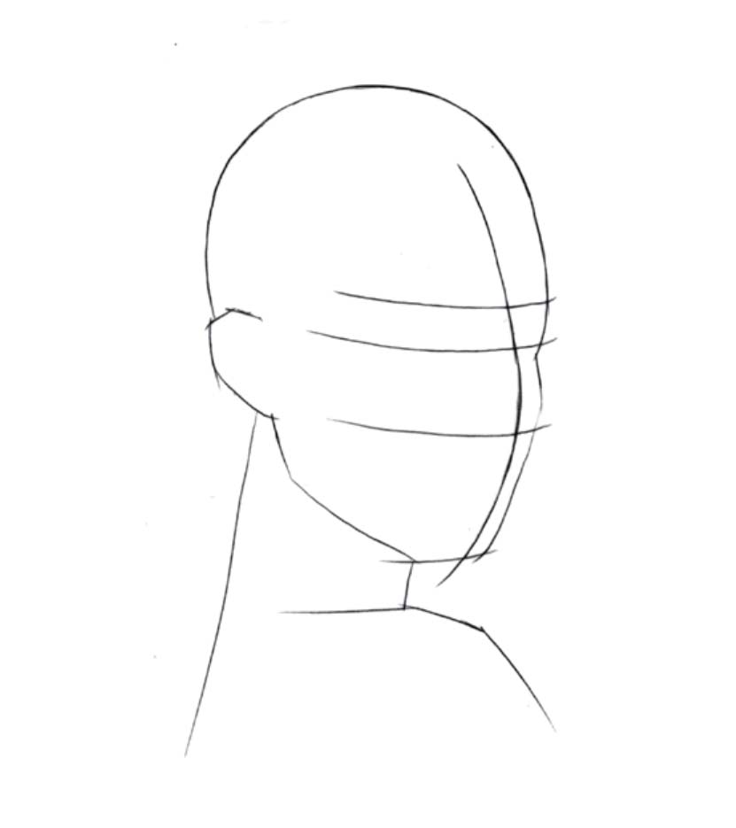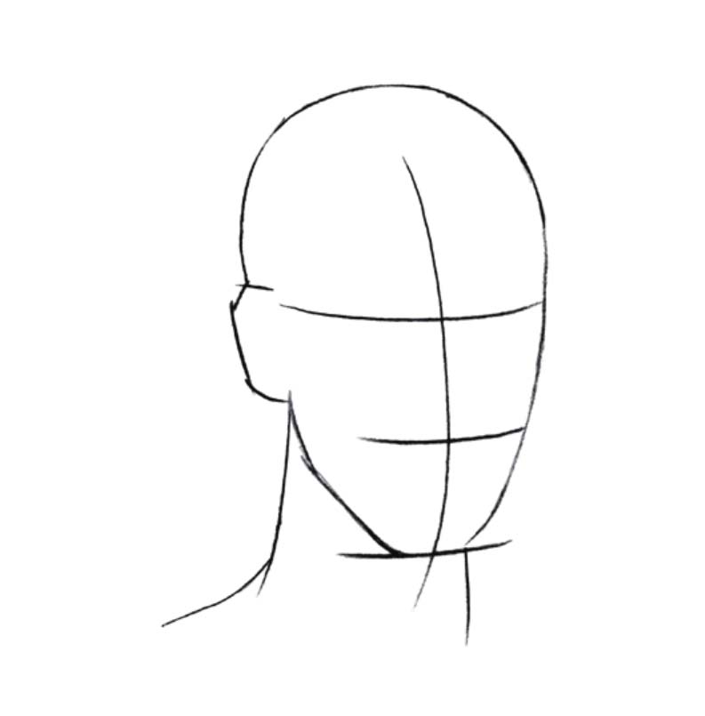 绘制一个饱满的椭圆形,确定耳朵的位置,顺势画出脖子,然后画出面部的透视线。侧面不同于正面,中线随球体角度变化成弧线,因此眉心的连线、鼻底线、嘴角连线是三条平行的弧线。