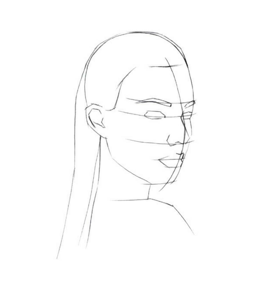 确定出人物五官的位置,3/4侧这一面的眼睛、眉毛、嘴的长度正常,另一侧的长度缩短,鼻翼和鼻孔随着角度的变化而变化。然后根据头部的外轮廓,绘制出发型轮廓线。