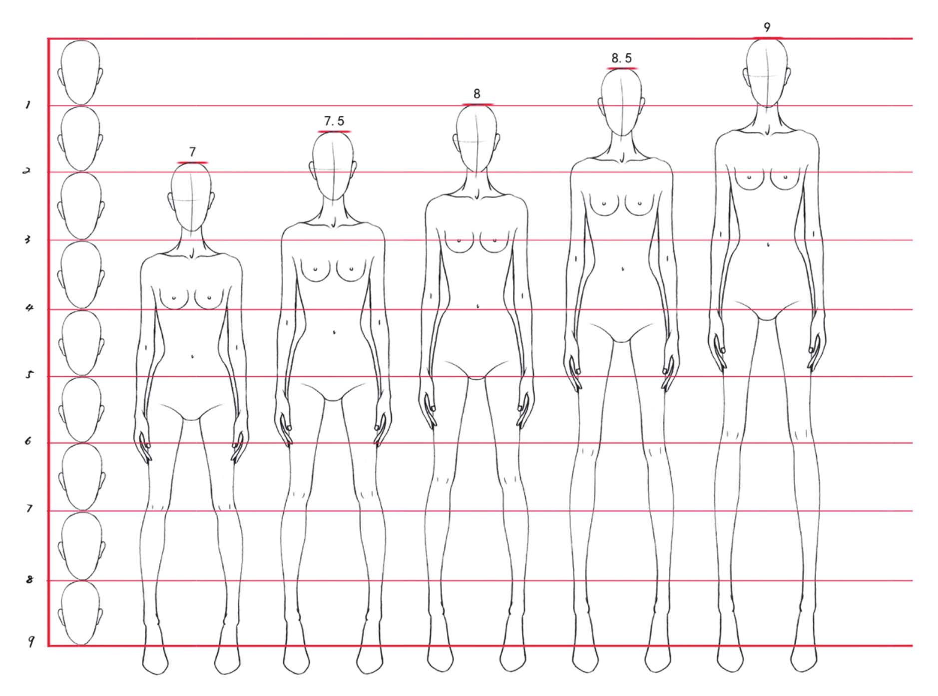 绘制时以脚后跟为底部,将头的长度作为参照。正常的人体比例为7头至7.5头身,而在绘制时装画时以8.5头身的比例最常用,能够很好地展现出服装的特点。当遇到体积比较大的服装或拖地的长裙时,可以采用9头身的人体比例进行绘制。