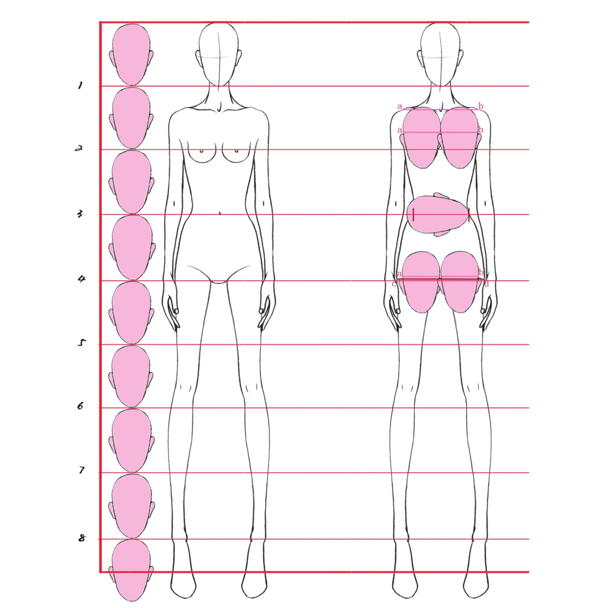 第3头长:乳突点至肚脐,在这一区域绘制胸围线至腰围线,从胸部的下半部分往下,腰部外轮廓逐渐内收,体现出女性纤细的腰部,女性腰部的宽度为发际线到下颚的长度。