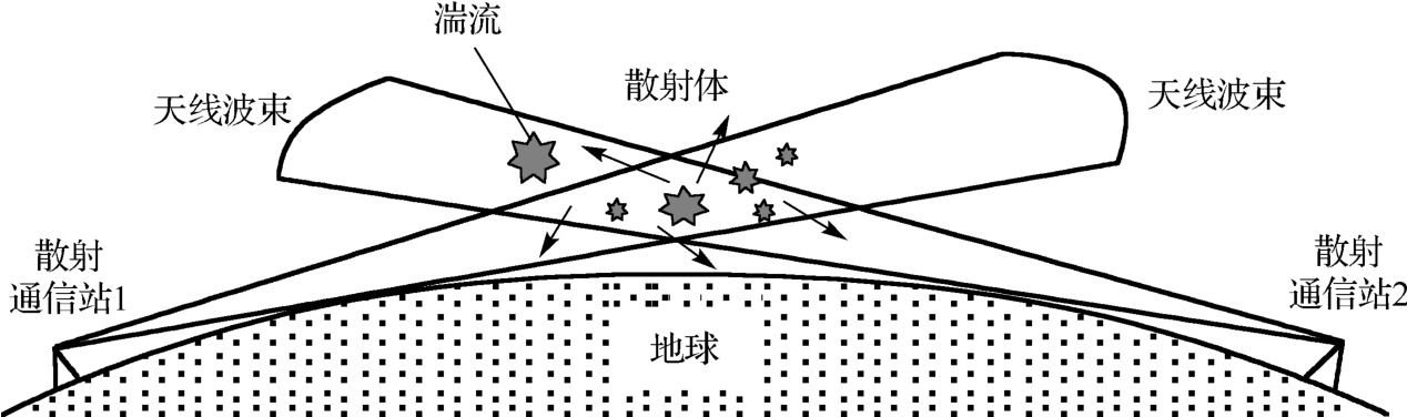 散射理论(湍流非相干散射)认为,电波在对流层中的散射传播是湍流不相干散射传播,如图2-3所示。由于在对流层中不断产生大气涡流(湍流),使温度、湿度和气压发生随机变化,引起大气折射指数N s 的变化。当电磁波进入这种折射指数不断起伏的区域(散射体)时,由大气的不均匀性产生散射。部分前向散射波落到接收天线的波束内从而形成超视距传播。