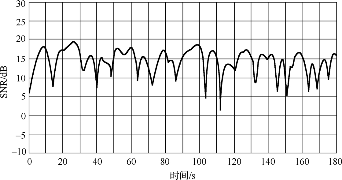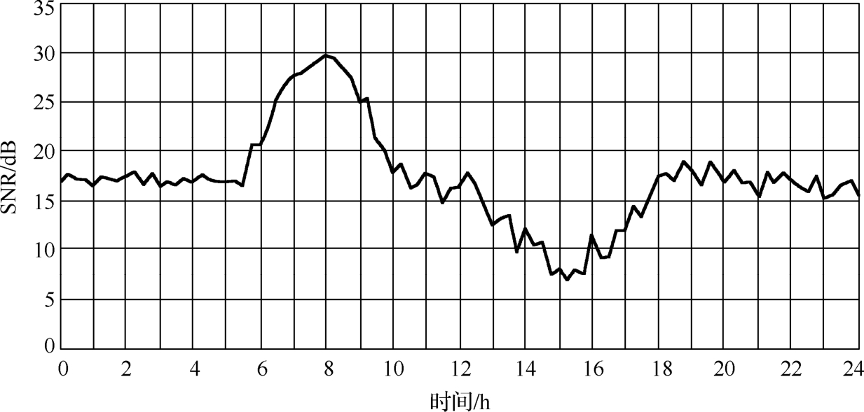 为给读者提供一个散射信号电平变化的直观印象,图2-9绘出了一条C频段散射链路的24小时平均信噪比曲线,这条链路地处华北平原、距离150 km。可以看出,早晨7点到9点链路上出现了大气波导现象,信号电平比其他时段高出20 dB左右。上午9点之后,经过近1小时的“近似大气波导”过渡,接收电平不断降低最终转变为典型散射信号。中午12点到下午16点信号电平最低。至18点信号电平开始逐渐回升,上升幅度有6~7 dB。从18点到午夜24点,信号电平有略有起伏,之后整个夜间电平保持稳定。凌晨5点后信号电平再次逐渐增强,即使没有大气波导电平也常常比其他时段高。