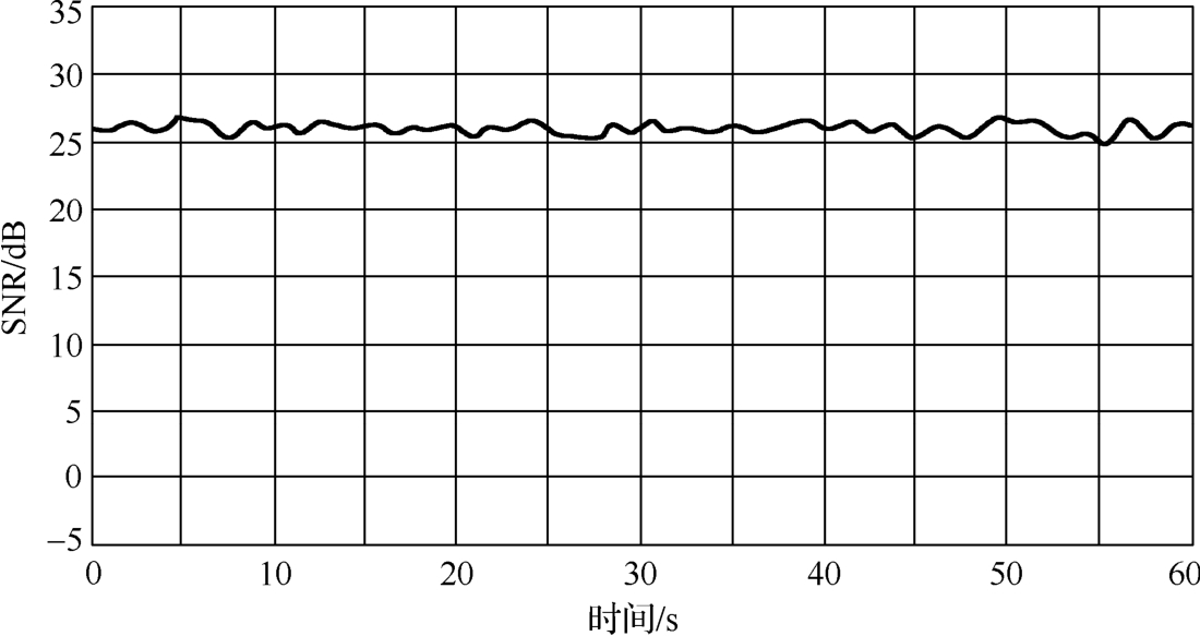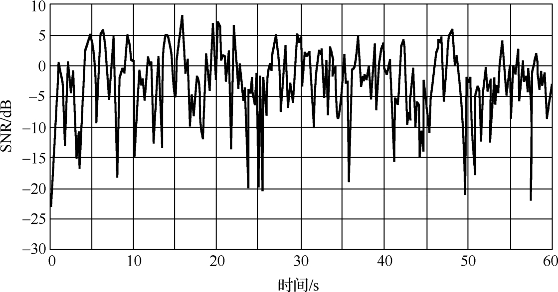 从时域看这类信号具有明显的快衰落特征,利用C频段设备在200 km的距离进行测试,它的衰落速率一般在10 Hz以内,并且随着频率的升高和距离的变远而加快。如果该散射信号是一个单频信号,通过对其统计特性进行分析可发现它的幅度基本符合Rayleigh衰落。如果该信号是一个宽带信号,在频域上它的衰落具有明显的频率选择性,其相关带宽在几MHz的量级。这种信号的传播机理用湍流不相干散射理论来解释最为贴近,对目前主流设备所用频段,如C频段、X频段甚至更高的Ku频段,所占的比例估计不低于70%。对通信链路来说,它是接收机信号处理的最典型的对象,因此本书将它称为“典型散射信号”,图2-6所示是这类信号的一个1分钟时域样本。