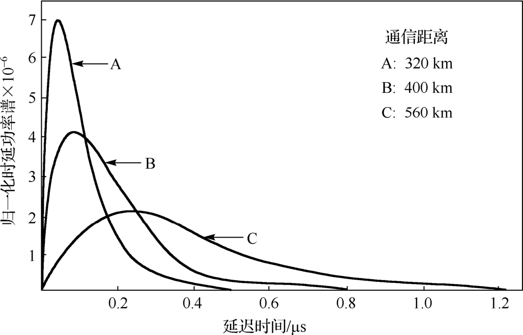 时延功率谱 ρ c ( τ ,0)是对流层散射链路很重要的设计参数,它可以用宽带扩频信号进行测量。原理为:在发射端发射一个直接序列扩频信号或线性调频信号,接收端对该信号解扩(采用与发端相同码型匹配滤波,或采用滑动相关器相关运算)之后可获得 c ( t ; t 0 )和 p ( τ ; t 0 )的多个样本,对 p ( τ ; t 0 )进行平均即能得到时延功率谱 ρ c ( τ ,0)。