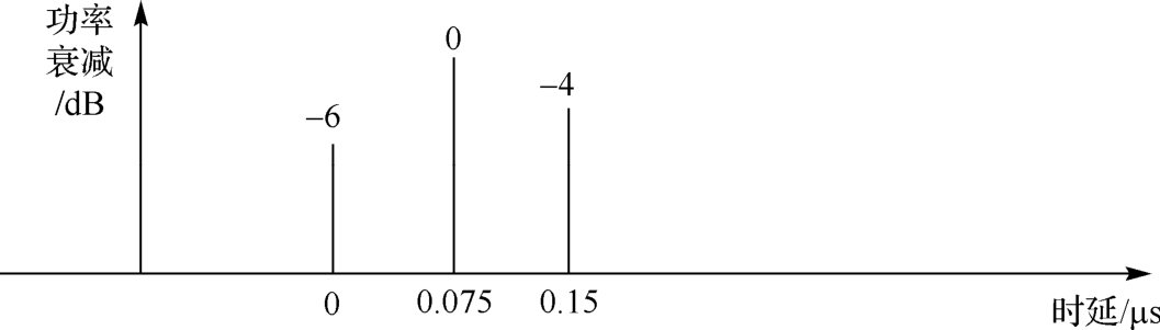 第二种情况建议约定径数为3,各径的相对衰减如图2-21所示。与上面同理,如果实际通信距离很远,只是欲了解设备在信道出现反常传播下的工作状态,则可将3径之间的时间间隔按比例增大后测试。