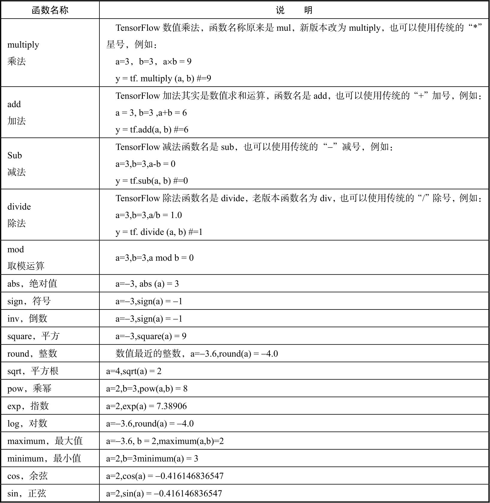 前面的案例,我们从多个角度介绍了 TensorFlow 的基本运算,下面通过表 4-1再介绍一些TensorFlow常用的数值运算。