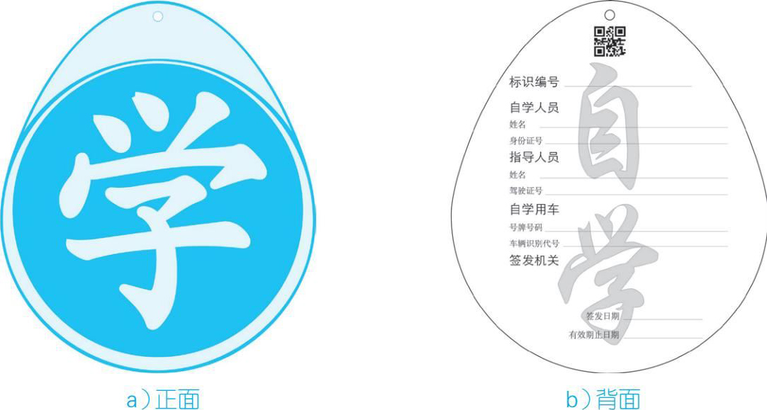 如图1-18所示,学车专用标识签注有自学人员、指导人员、自学用车的有关信息。学车专用标识只允许签注一名自学人员、一名随车指导人员、一辆自学用车。每名随车指导人员、每辆自学用车不得同时签注于两个及两个以上学车专用标识。已经签注过的随车指导人员或者自学用车,需要培训另一名自学人员的,自上次签注之日起三个月后,方可重新领取学车专用标识。