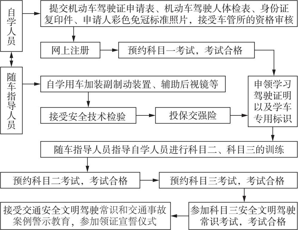 自学直考关系到自学人员、随车指导人员、自学用车等多个方面,涉及的环节比较多,程序相对复杂,自学直考的流程如图1-17所示。