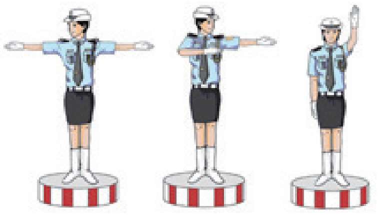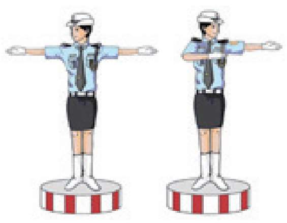 3)转弯。只要交警的手是向上竖起弯曲的,就一定是转弯手势,这时交警伸出的手臂指向哪边就是往哪个方向转弯。