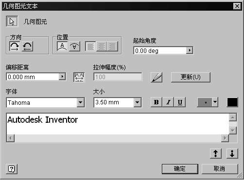 在“几何图元文本”对话框“文本”区域下面输入“Autodesk Inventor”,单击