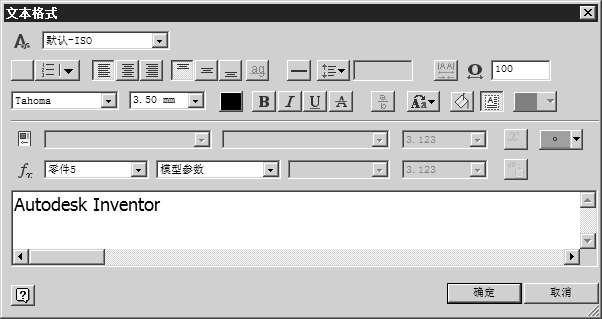 在“文本格式”对话框“文本”区域下面输入“Autodesk Inventor”,其他选项采用系统默认设置,然后单击