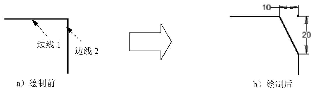 按钮,在“倒角边长1”文本框中输入距离值10,在“倒角边长2”文本框中输入距离值20;在绘图区域选取图2.4.3所示的边线1与边线2,系统便在这两个图元间创建倒角,并将两个图元裁剪至交点。
