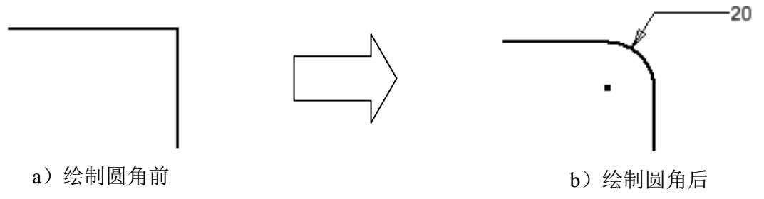 在“二维圆角”对话框“半径”文本框中输入数值20,然后选取两个图元(两条边),系统便在这两个图元间创建圆角,并将两个图元裁剪至交点。