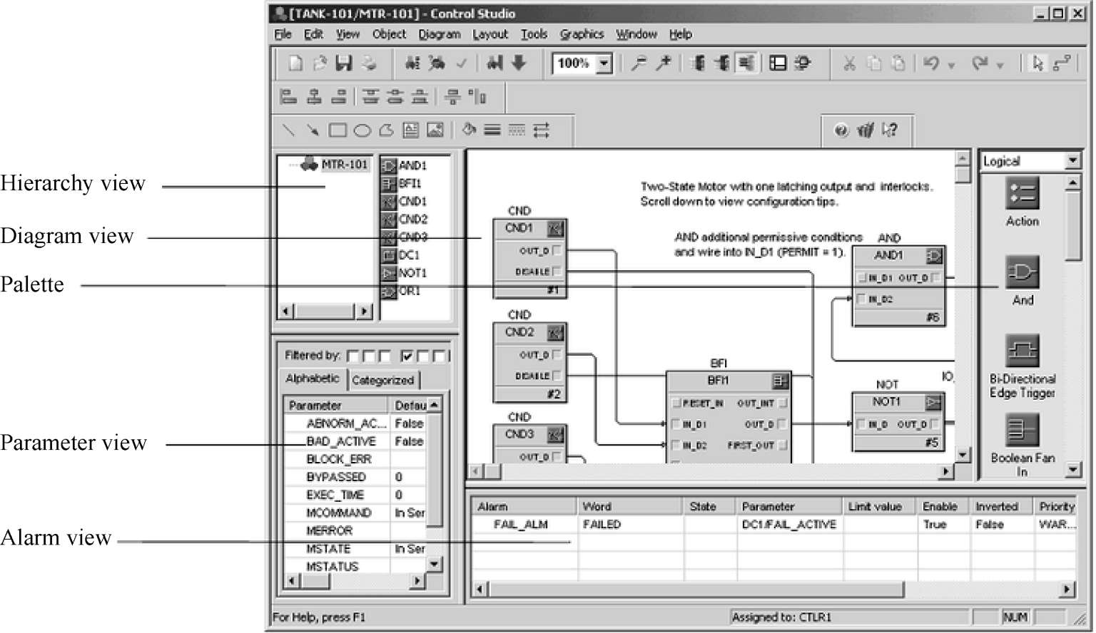 DeltaV控制工作室用于为用户的控制策略创建、修改和删除模块,为控制模块提供完整的编辑功能。图2.31所示为DeltaV控制工作室的分区视图界面。系统提供了IEC 61131图形化控制策略,所有的控制策略都由标准图形完成。DeltaV控制工作室可以简化系统组态过程,利用标准的预组态模块及自定义模块可以方便地学习和使用系统组态软件。