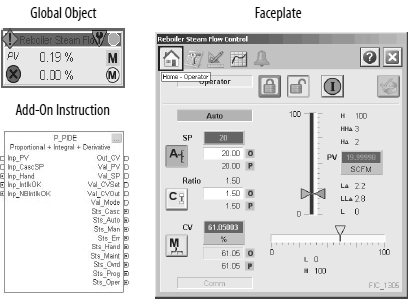 DCS控制器中的功能块与人机界面的面板通常成对出现,即在控制器中组态一个PID回路后,在人机界面组态时可以直接根据该回路名称调用一个具有完整的PID功能的人机界面面板,面板中的参数自动与控制回路中的一一对应,罗克韦尔公司的PlantPAx集散控制系统的增强型PID功能块及其控制面板如图2.34所示。而SCADA系统必须自行设计面板,设计过程较为烦琐。