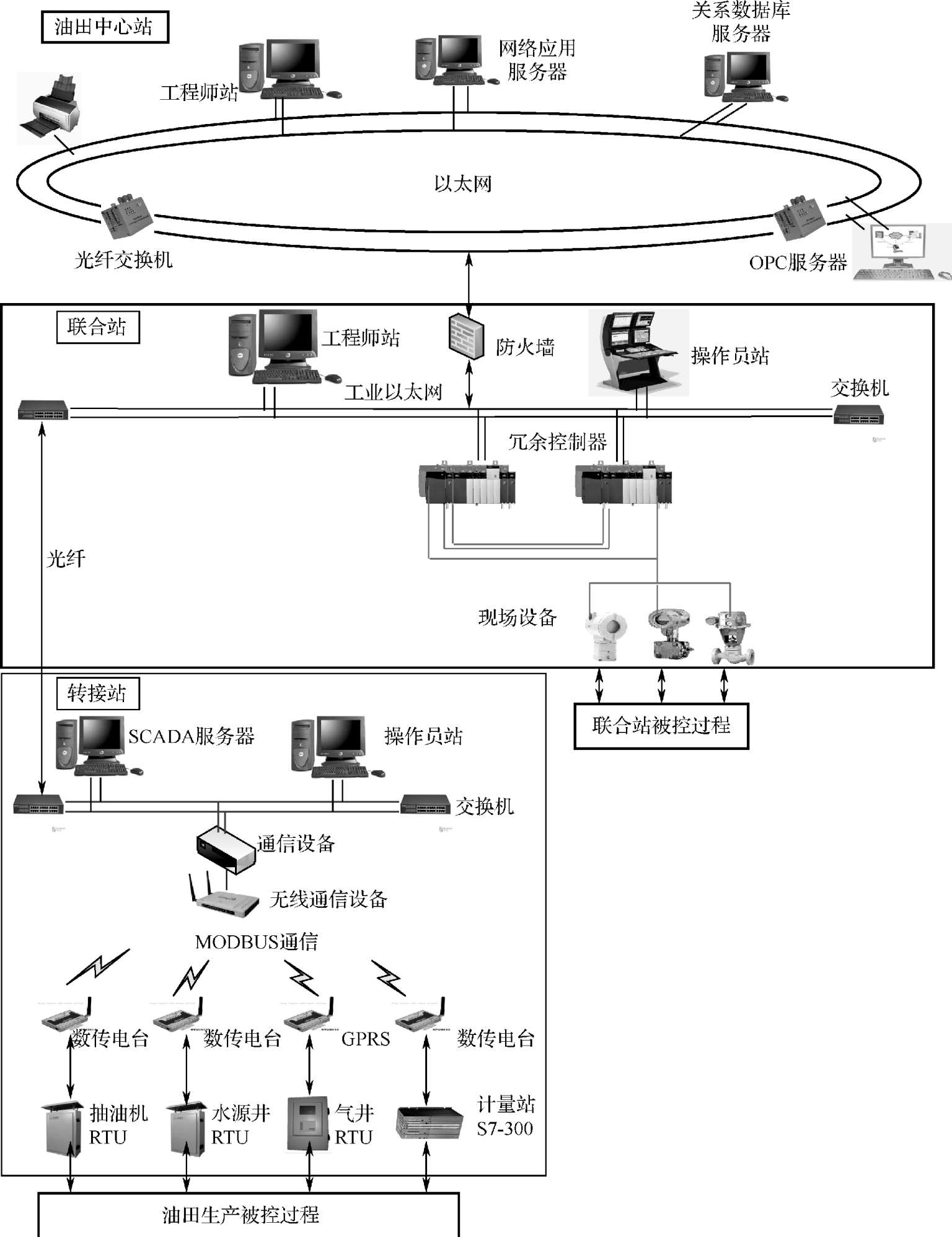 SCADA是英文“Supervisory Control and Data Acquisition”的简称,翻译成中文就是“监督控制与数据采集”,也称作“数据采集与监督控制”。严格来说,SCADA的英文原意并没有监视的含义,因此,把SCADA翻译成“监视控制与数据采集”是不妥的。从SCADA的名称可以看出,SCADA系统包含两个层次的基本功能,即监督控制和数据采集。图2.32所示为某油田的大型SCADA系统结构示意图,该系统包括位于井口的现场控制层设备,如RTU和PLC、转接站监控子系统、联合站控制系统(通常采用集散控制系统)和油田中心站监控系统。从该大型SCADA系统可以看出,即使是DCS这样的大型工业控制系统,也可以是SCADA系统的现场节点。像“西气东输”这样的大型SCADA系统的站控系统还具有紧急停车系统,该紧急停车系统也是SCADA系统的一部分。