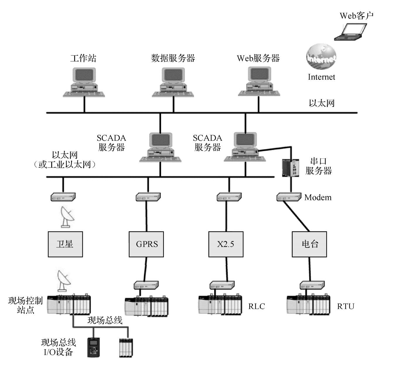 通信网络实现SCADA系统的数据通信,是SCADA系统的重要组成部分。与一般的过程监控相比,通信网络在SCADA系统中扮演的角色更为重要,这主要是因为SCADA系统的监控过程大多数具有地理分散的特点,如无线通信机站系统的监控。一个大型的SCADA系统包含多种层次的网络,如设备层总线、现场总线;在控制中心有以太网;而连接上、下位机的通信形式更加多样,既有有线通信,也有无线通信,有些系统还有电台、卫星等通信形式。