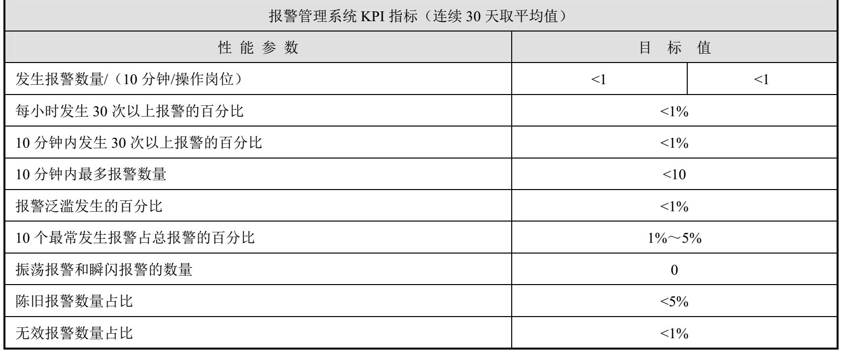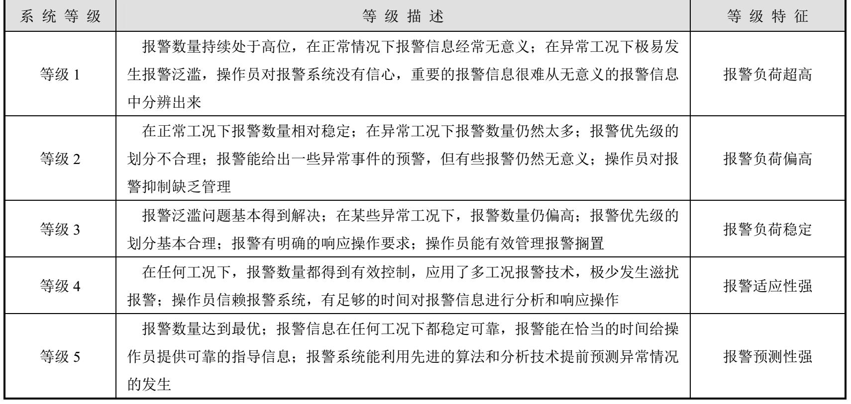 根据工程实践的经验和典型报警管理系统KPI指标,EEMUA191将报警管理系统划分为5个等级,如表2.3所示。在实际的工业过程中,报警管理系统KPI指标如表2.4所示。