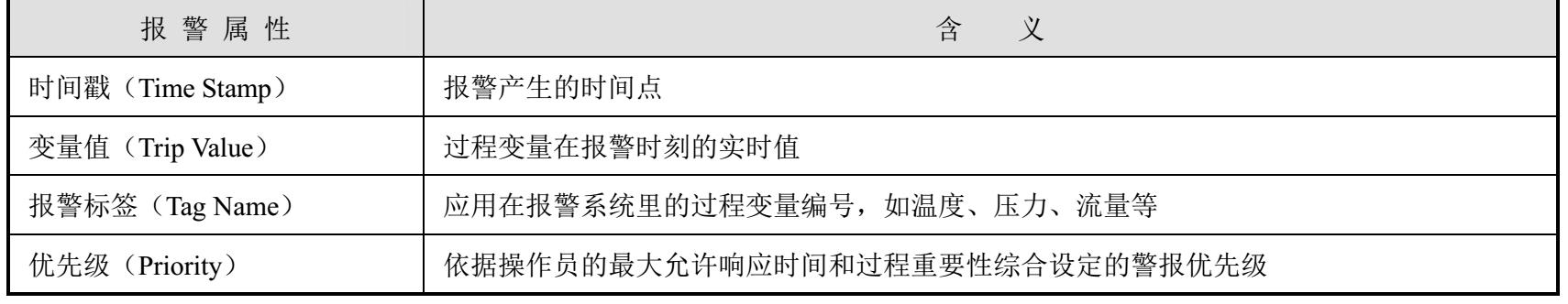 操作台的报警信号通常由多种属性来供操作员确定异常工况发生的时间、严重程度及故障过程原因,报警属性及其含义如表2.2所示。