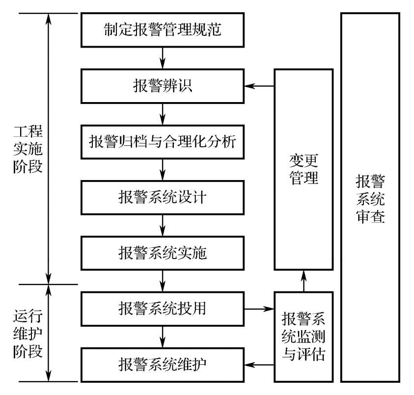 变更管理。为保证报警系统的完整性和有效性,报警系统应建立变更管理工作流程,从而有效地管理报警系统的变更。变更管理需要经过申请、评估、审查、批准、实施、培训、监督等流程。审批过的报警变更应保存至主报警数据库中,所有的报警变更应通知报警系统负责人。