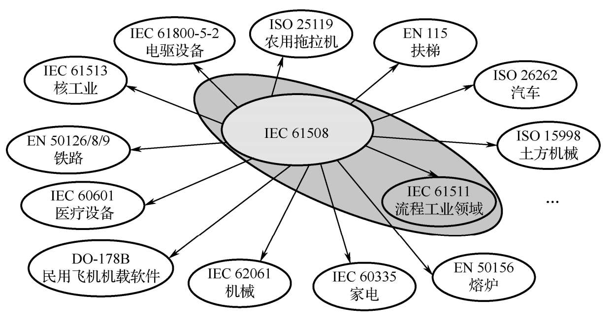 从管理措施角度来看,国内外标准机构颁布了大量相关标准和指南。仅《电气/电子/可编程电子安全系统的功能安全》(IEC 61508)就产生了面向不同行业的大量行业标准,如图1.2所示。各国政府也发布了一系列安全生产法律、法规,以加强工业安全监管。由于工业信息安全事故会造成比以往传统安全事故更加严重的后果,因此,各国政府特别重视关键基础设施的信息安全。例如,美国政府相关部门在2013年制定了关键基础设施网络安全框架,从识别、保护、检测、响应、恢复五个维度和资产管理、人员评估、安全意识培训、连续监测、响应恢复等方面加强网络安全风险管理。我国的《网络安全法》第五条也明确规定,国家应采取措施对关键基础设施进行保护。