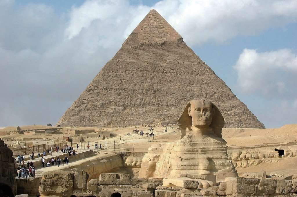 古埃及的文明是一种帝国文明而非城市文明。埃及是一个长时间处于同一王朝统治下的大河流域国家。在公元前3100年,一名叫纳尔迈(Narmer)的国王统一了埃及,建立了埃及的第一个王朝,这是人类历史上第一个王国。法老王统治的领土有数千平方公里,人口达数十万。19世纪末出土的纳尔迈石板上有最古老的象形文字,这些文字比中国出土的最早的甲骨文还早了一千多年。埃及最大的三个金字塔:胡夫金字塔、海夫金字塔和孟卡拉金字塔都修建于埃及的古王国时期(公元前27世纪到公元前22世纪)。金字塔不仅是古埃及的象征,而且体现了全世界古代文明的最高成就(见图1-3)。