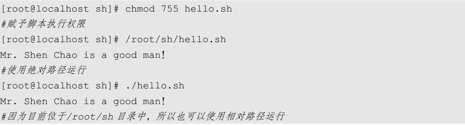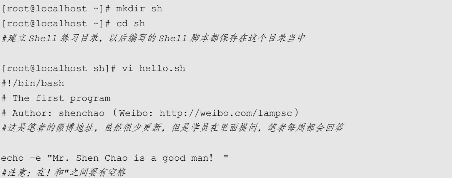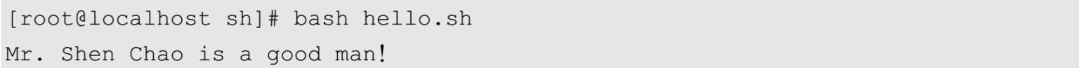 既然echo命令可以直接打印“Mr. She Chao is a good man!”,那么,将这句话放入Shell脚本中也是可以正确执行的,因为Linux系统命令是可以直接在脚本中执行的。