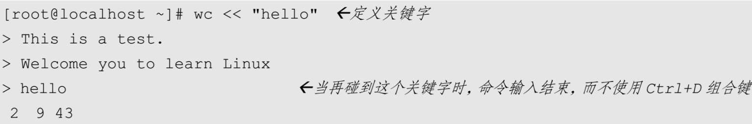 还有一个输入重定向符号“<<”,这个符号的作用是使用关键字作为命令输入的结束,而不使用Ctrl+D组合键。命令如下: